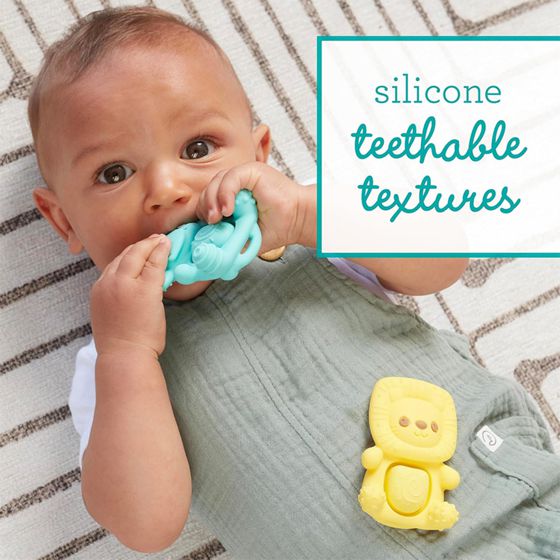 Ovaj set od dvije mekane silikonske grickalice dizajniran je kako bi bebama pružio različite teksture za umirivanje osjetljivih desni. S ovim zabavnim, ali praktičnim grickalicama, vaša beba može razvijati svoje rane fine motoričke vještine koristeći koordinaciju ruku i očiju kako bi pritiskala neodoljive senzorne trbuščiće koji pucketaju. Savršene su veličine za držanje i istraživanje znatiželjnih malih ručica, a istovremeno pružaju ugodno iskustvo stavljanja u usta za bolne zubiće koji nicaju. Petlja na stražnjoj strani svake grickalice olakšava pričvršćivanje na kopču za dudu ili bilo koje drugo prikladno mjesto kako bi uvijek bile pri ruci i nikada se ne bi izgubile. Nakon svake upotrebe, obrišite grickalice za brzo čišćenje. Infantino Pop Pals će vašem mališanu pružiti puno zabave i umirujuće udobnosti.