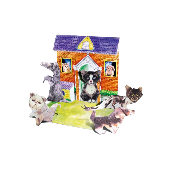 Set Origami Pets sadrži likove: psa Taigana, mačku Maine Coon, američku kratkodlaku mačku, psa Beaglea, himalajsku mačku, kućicu za kućne ljubimce 1x sklopljeni lik psa Taigana i upute za savijanje.